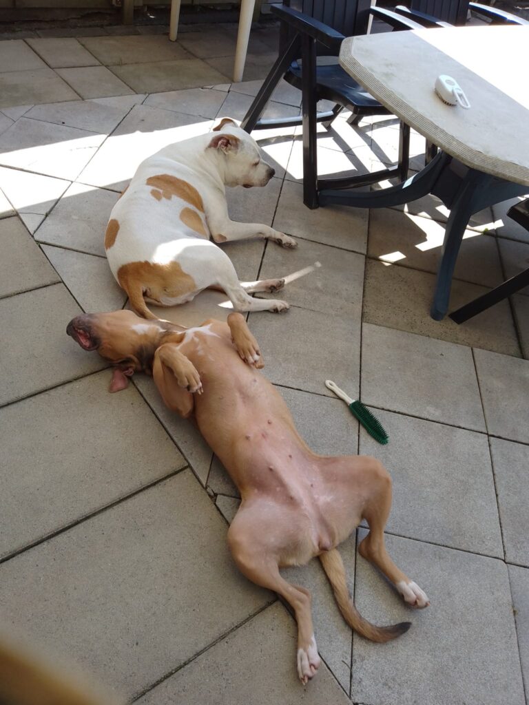 Doordat Jacky iets verkeerds had gegeten ging haar allergie parten spelen, ze moest klapperen met haar oren en erg krabben. We konden haar nog niet adopteren omdat zij hiervoor medicijnen kreeg. Na 5 afspraken gehad te hebben met ons alleen en 4 afspraken met Djeko erbij en een kennismaking bij ons thuis hebben wij Jacky na 499 dagen in het assiel gezeten te hebben mogen adopteren op 9 augustus 2025.