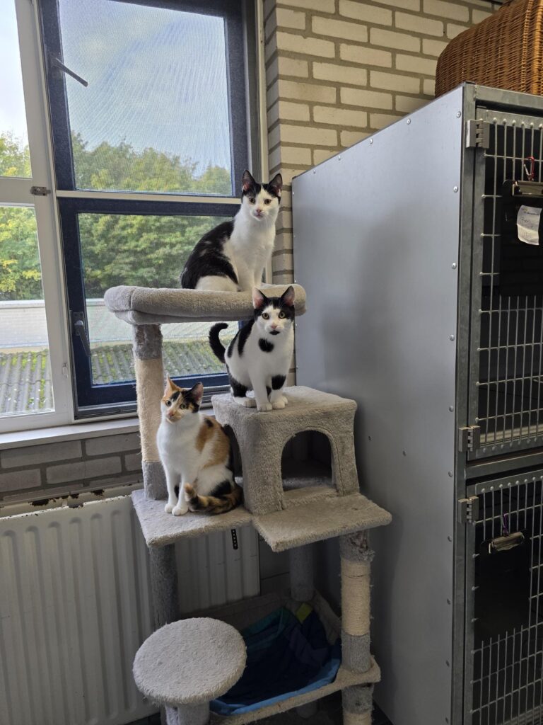 Na 3 maanden ging het eindelijk de goede kant op en konden we op zoek gaan naar een huisje voor dit stel. Eerst nog met het idee dat er 2 samen zouden blijven en 1 naar een huisje bij een ander gezellige kat. Aangezien de dame en heren al aardig groot werden, werd besloten om ze voor de plaatsing te neutraliseren. Dat doen we sowieso op de leeftijd van 6 maanden, maar in dit geval waren Ben, Angie en Henk al groot genoeg om dit nu al te doen. Fijn toch, als kittens al steriel de deur uit gaan.