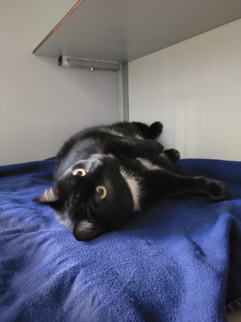 Met grote pupillen kijkt ie je aan, OMG wie komt er nu weer binnen…. kruipt zo ver mogelijk in een hoekje van zijn hok in afwachting van wat er gaat gebeuren. Maar… gelukkig houdt deze lieverd van 1 jaar jong van eten. En met veel geduld, moed, beleid en trouw, durft ie, als hij je kent en je even de tijd neemt, wel een stukje snoepstaaf aan te nemen. Of nog beter: liquid snack op te likken. Als hij daarmee bezig is, mag je hem voorzichtig aaien, voorzichtig, en ja, het ruggetje wordt bol en de billen gaan omhoog, er wordt zo waar gespind.