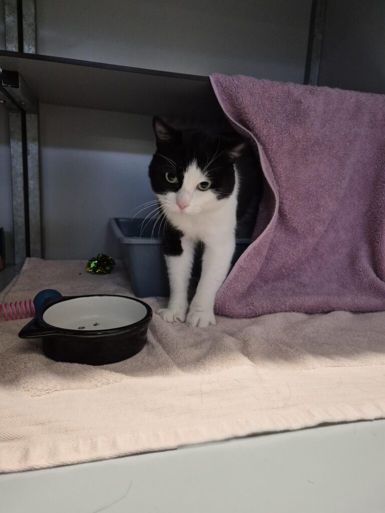 Klaske kwam hier binnen samen met een andere kat. Hij zou uit een huis komen waar veel andere katten waren. Toen Klaske hier net was moest hij niets van ons hebben. Hij bewoon niet als je in de buurt kwam en lag vaak bang in zijn kattenbak. Ookal hadden wij een heerlijk plekje voor hem gemaakt. Al snel had hij door dat in de kattenbak liggen niet heel fijn was en ging hij op zijn kleedje liggen.