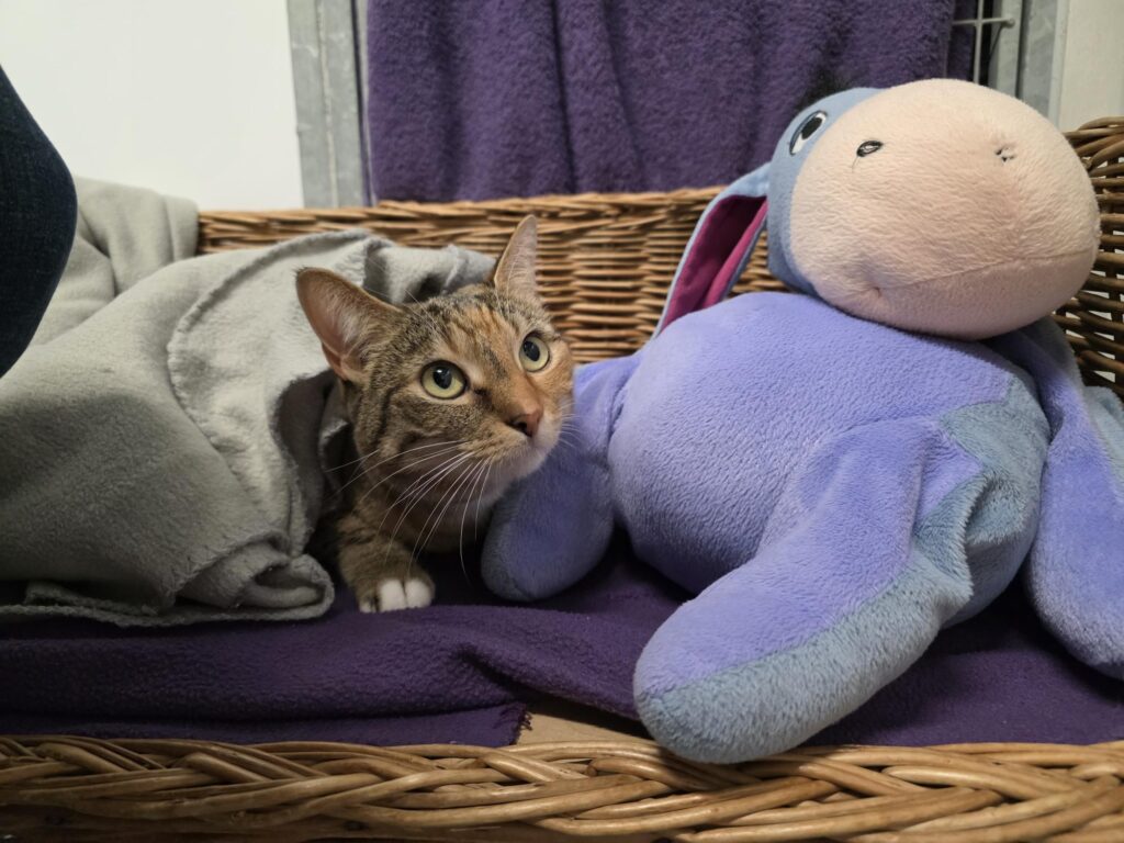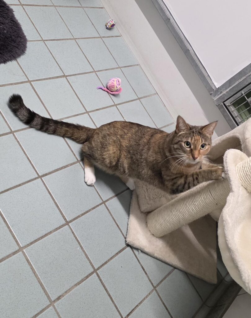 Gelukkig is Mia niet alleen maar bang. Ze kan enorm genieten van jouw gezelschap en vindt het heerlijk om rondgedragen te worden op je arm. Ze klets graag tegen je terug als je tegen haar praat. Spelen met balletjes en kleine propjes papier vindt ze ook geweldig en zo heeft ze ook haar gekke kwartiertje. Ze rent dan door het huis en gebruikt ook graag de krabpalen om haar nagels aan te scherpen. Samen spelen met een speelhengel met lang touwtje is ook heerlijk ontspannend om te doen. Als alle energie op is kruipt ze heerlijk onder de deken of ’s avonds bij je op bed.