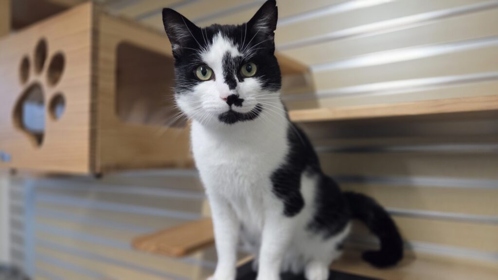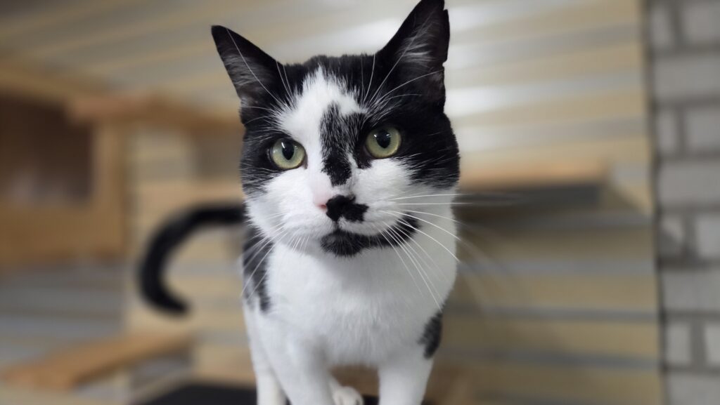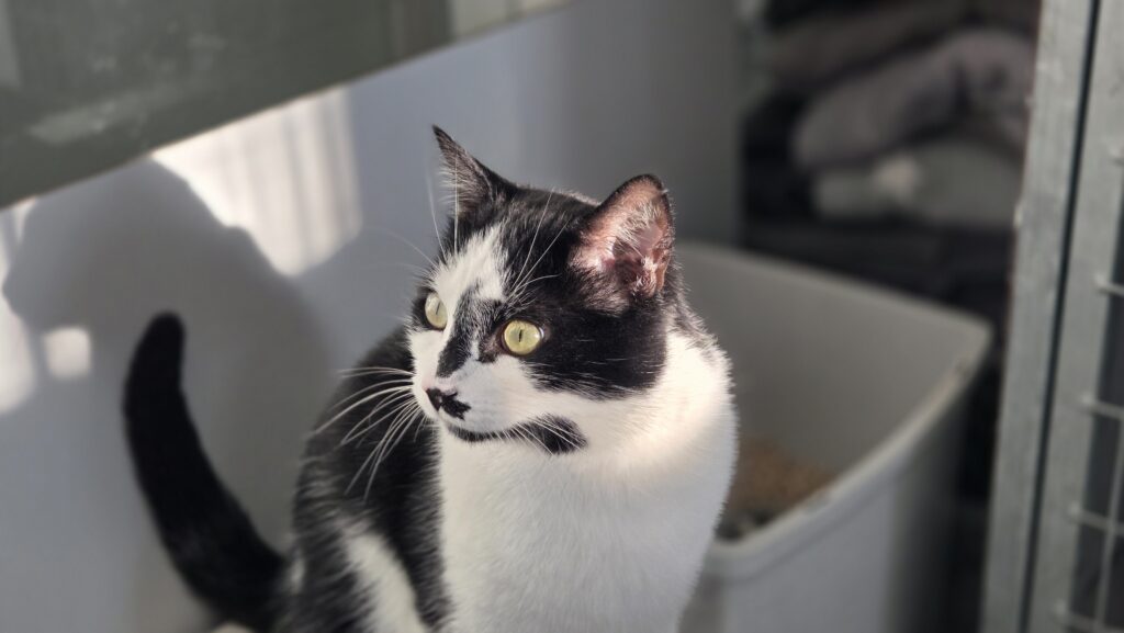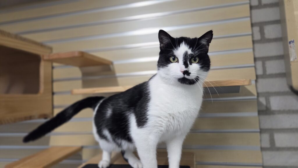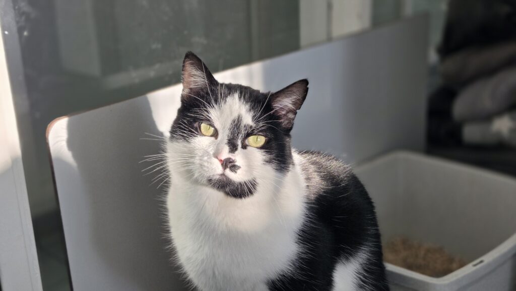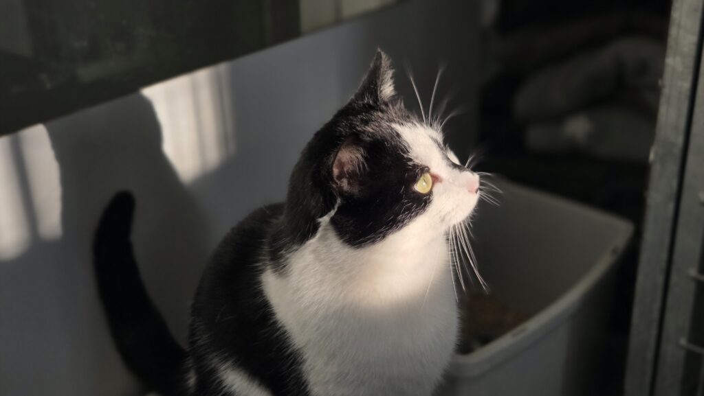 Dit is Santino, een lieve zelfstandige kater. Hij vindt het wel lekker om even geaaid te worden, maar daarna trekt weer zijn eigen plan. Zijn grootste hobby hier is eten, daar wordt hij heel erg blij, brokjes of snoepjes het maakt hem niet uit.