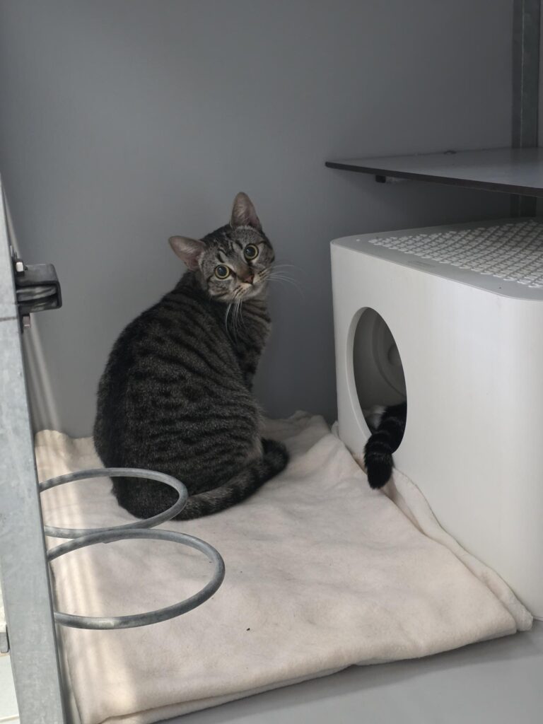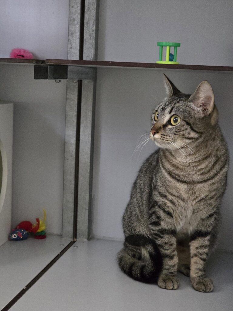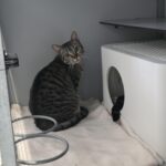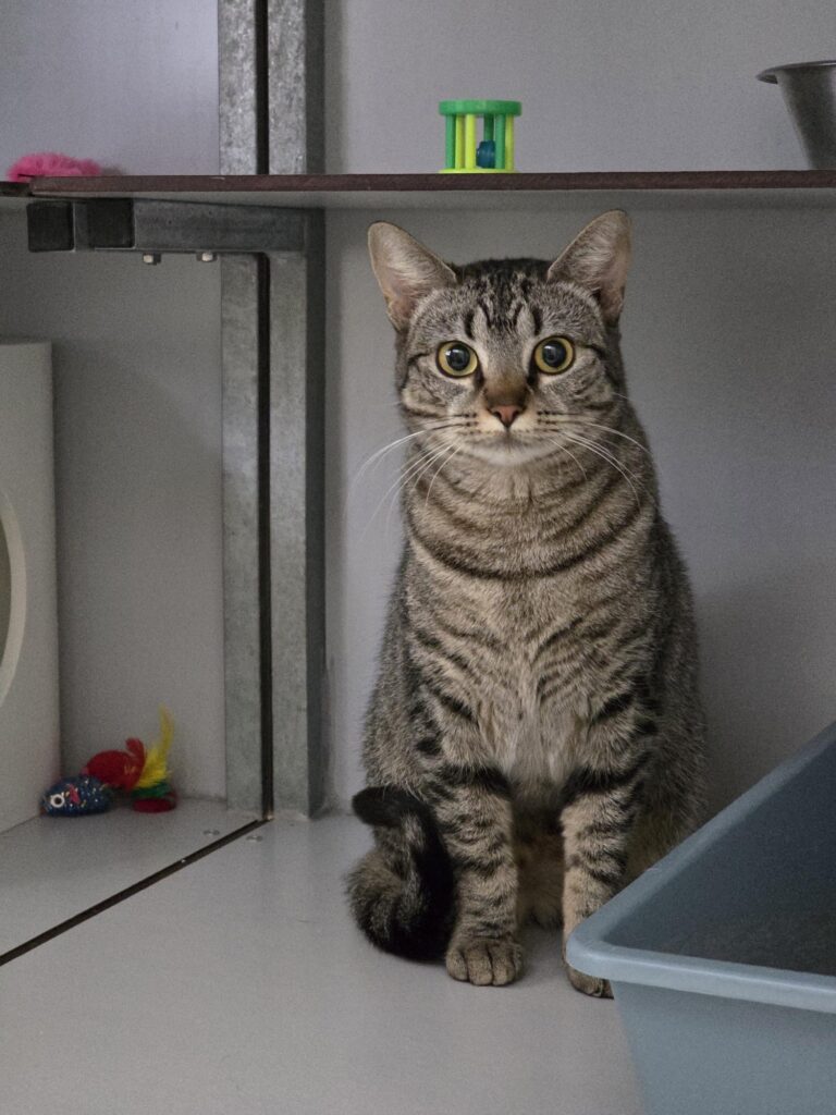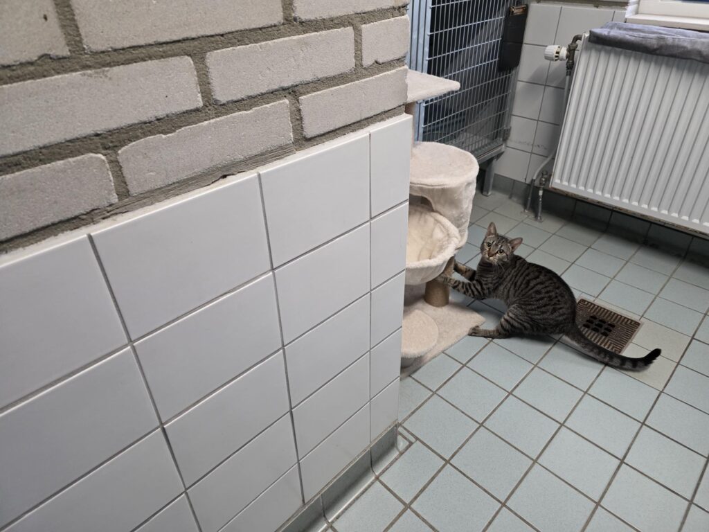 Steeds dapperder wordt dit meisje. Wama komt uit een huisje met meerdere katten. Ze is 1 van de laatste van dit klupje die er erg veel moeite mee heeft gehad dat ze in het asiel terecht is gekomen. Het heeft weken geduurd voordat ze uit haar schulpje kwam. Nog steeds is ze niet gediend van aaien. Maar onder tussen durft ze wel een snoepje aan te pakken uit de hand en wil ze graag haar hokje uit om de kamer te verkennen. Ook laat ze zich nu over halen om met een speel hengeltje te spelen. Toch blijft ze nog erg op haar hoede. Als het haar te eng word vlucht ze gauw haar hokje weer in. Sowieso laat ze zich niet zien of verleiden tot contact als je vreemd bent voor haar. Alleen bij de vaste verzorgers laat ze op dit moment iets van haar karaktertje zien: